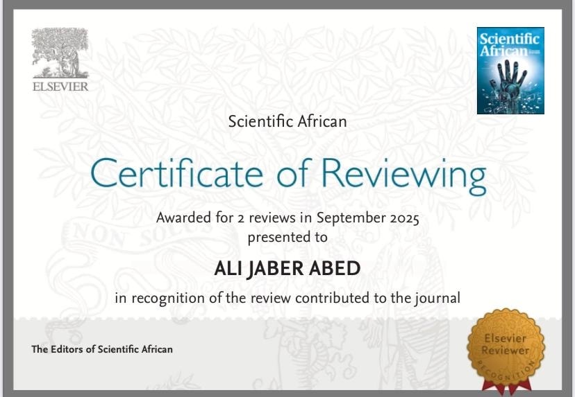 اختير التدريسي في مركز البحوث التربوية والنفسية بجامعة بغداد، المدرس المساعد علي جابر، مقيّماً علمياً في مجلة Scientific African المصنّفة ضمن الربع الأول (Q1) في قواعد بيانات ELSEVIER العالمية.
